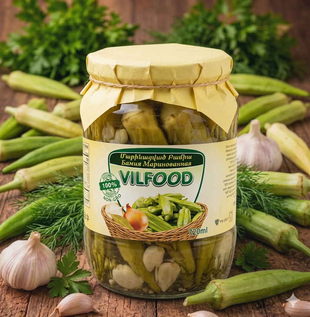 Vilfood Gombo mariné 605 g. Gombos frais marinés avec des herbes aromatiques, de l’ail et des épices pour un goût croquant et acidulé. Parfait en accompagnement de viandes, de poissons ou de plats traditionnels.
