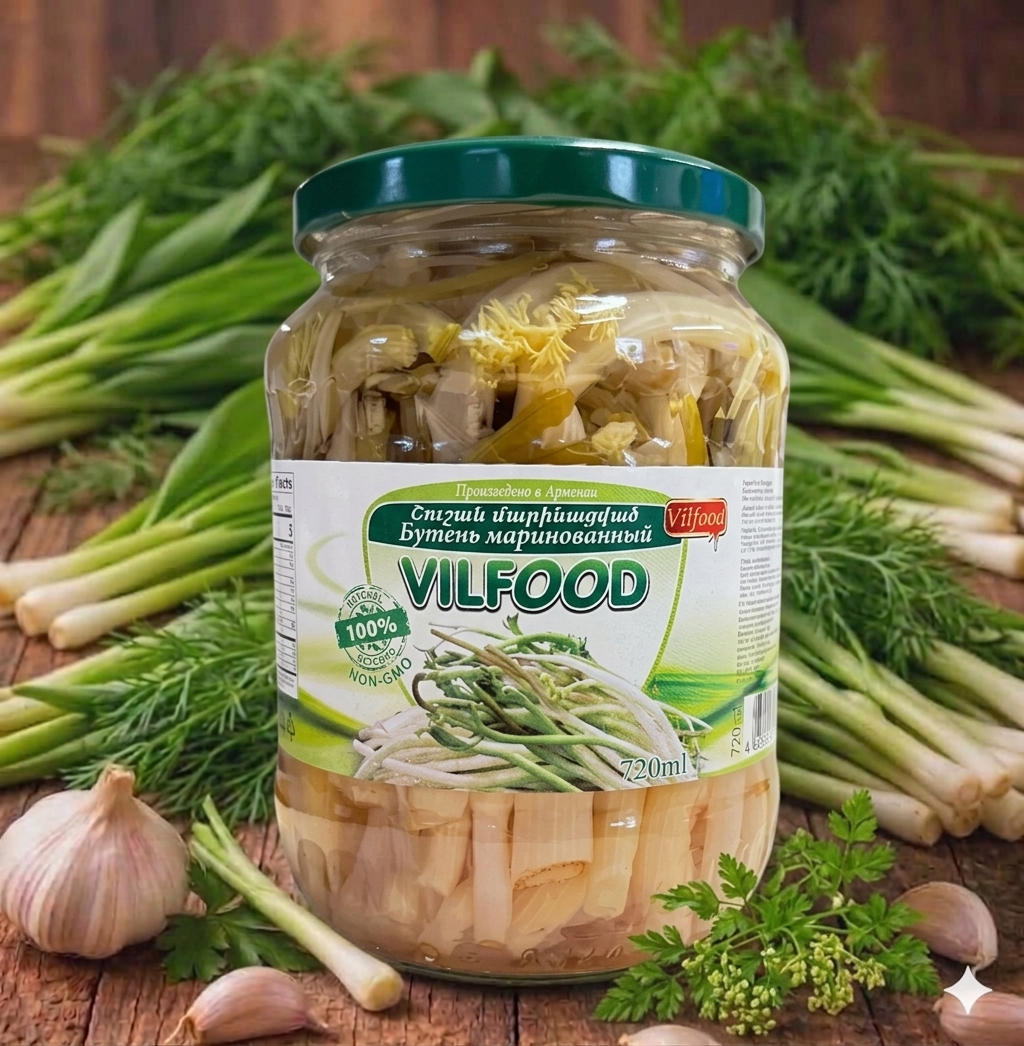 Vilfood Cerfeuil mariné 705 g. Tiges tendres de cerfeuil marinées avec des herbes aromatiques, de l’ail et des épices pour un goût raffiné et légèrement acidulé. Idéal en accompagnement de plats froids ou chauds.