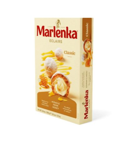 🔒 Price visible after approvalMarlenka Éclair 250 g. Soft mini éclairs filled with smooth caramel cream and lightly dusted with sugar powder. Combining the classic French pastry texture with Marlenka’s signature honey sweetness, these éclairs offer a rich and delicate taste in every bite. Pack size: 250 g.