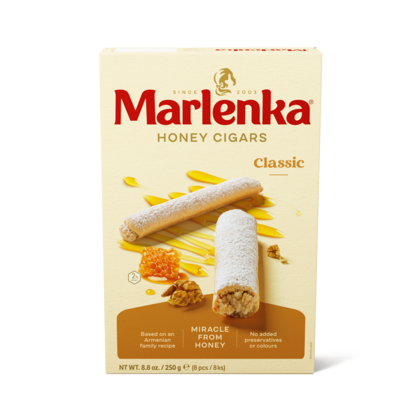 🔒 Price visible after approvalMarlenka Honey Cigars 250 g. Crunchy wafer rolls filled with smooth honey cream and lightly dusted with sugar. A delicate combination of crisp texture and gentle sweetness, made with natural honey. Perfect for serving with coffee, tea, or as a refined dessert. Pack size: 250 g.