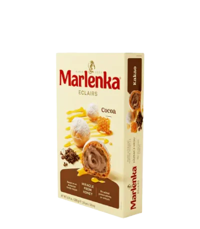 🔒 Price visible after approvalMarlenka Éclairs with Cocoa 250 g. Soft mini éclairs filled with creamy cocoa filling and dusted with powdered sugar. A refined twist on the original Marlenka éclair, combining rich chocolate flavor with natural honey sweetness. Perfect with coffee or tea. Pack size: 250 g.