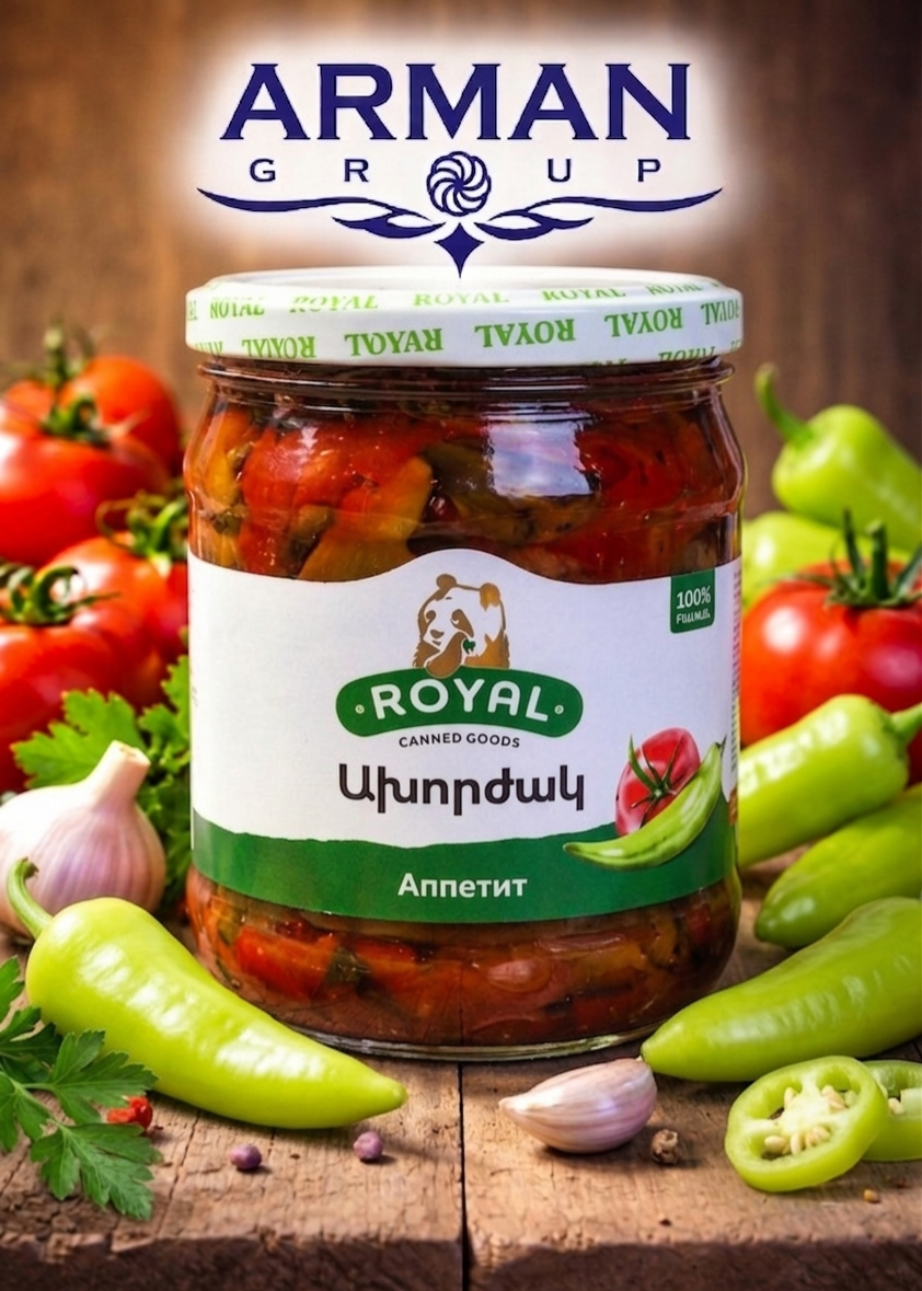 Royal Appetite 480 g. A rich vegetable spread made from tomatoes, peppers, and eggplants, seasoned with herbs and spices. Delicious as a side dish or on bread.