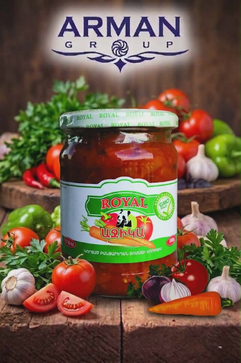 Royal Adjika Spicy 350 g. Traditional hot Caucasian sauce made with tomatoes, peppers, garlic, and herbs. Ideal with grilled meat, poultry, or bread.