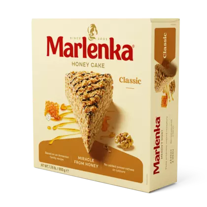 Marlenka Honey Cake 800 g. A delicious multilayered honey cake made from natural ingredients based on a traditional Armenian family recipe. Soft layers infused with honey and cream create a rich, authentic taste. Perfect for celebrations or everyday enjoyment. Pack size: 800 g.