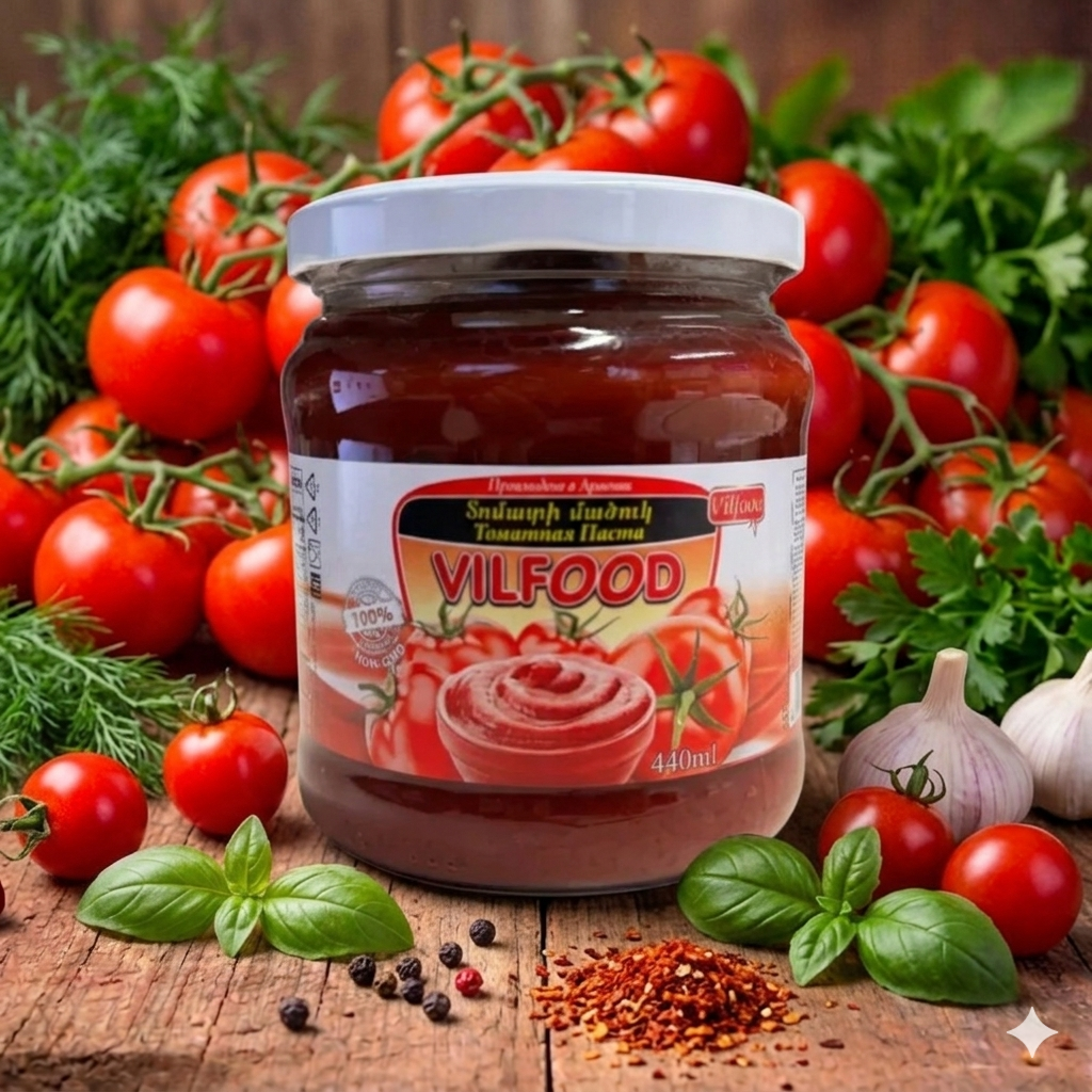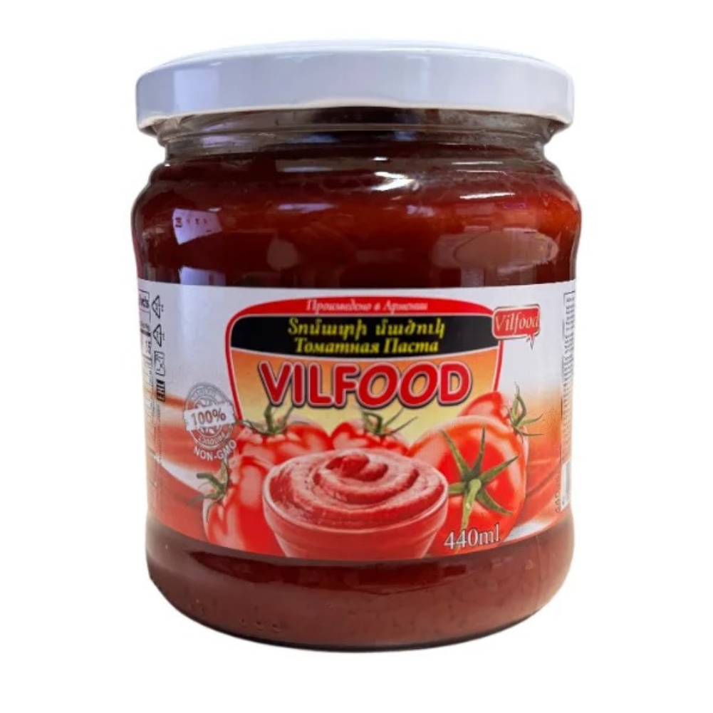 Vilfood Tomato Paste 470 g. A rich, thick tomato paste made from ripe Armenian tomatoes, slow-cooked to preserve their natural sweetness and deep flavor. Ideal for sauces, soups, and traditional dishes.
