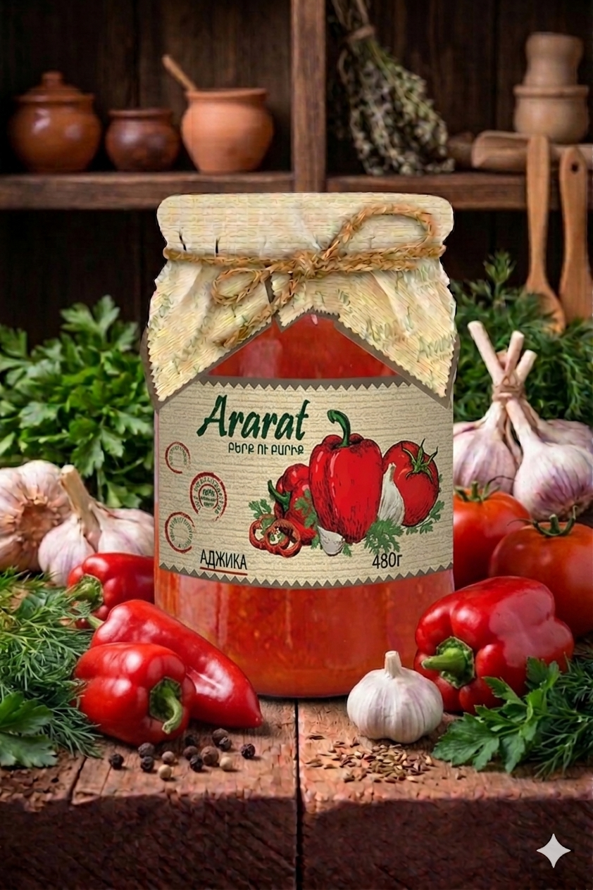 Ararat Ajika 480 g. A traditional spicy paste made from red peppers, garlic, and aromatic herbs. Known for its bold flavor and rich texture — perfect as a condiment, marinade, or sauce for meat and vegetables.