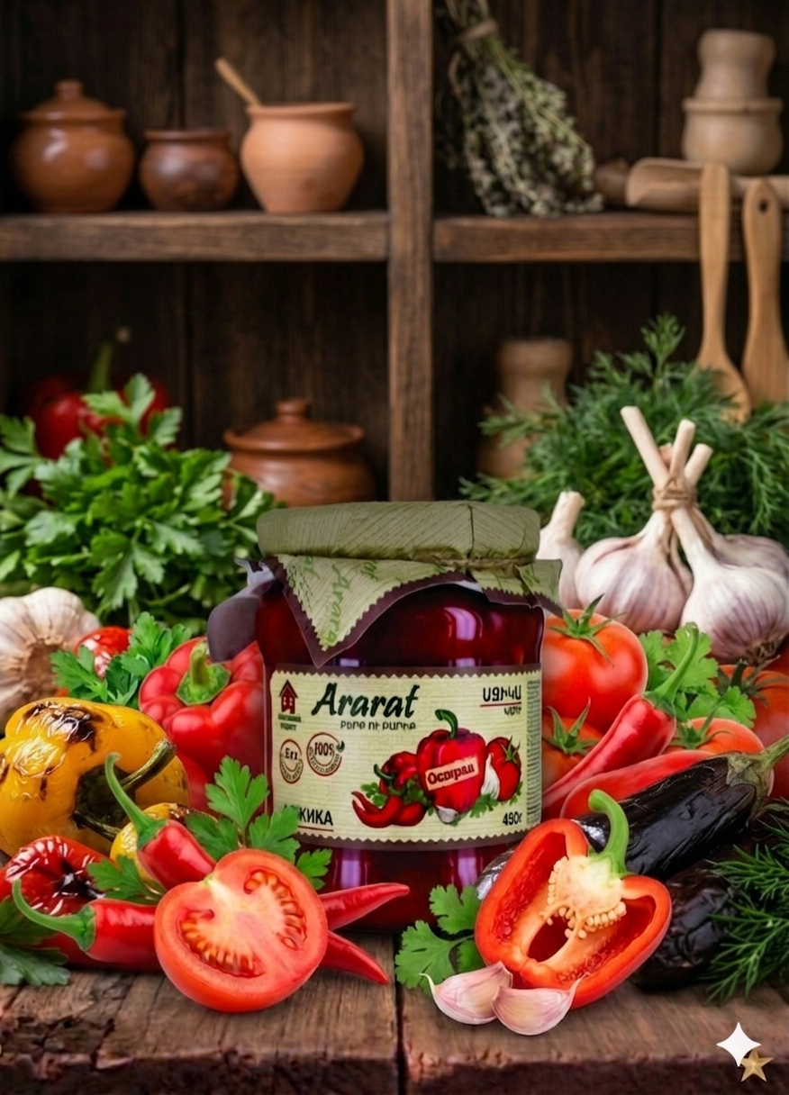 Ararat Ajika Piquant 480 g. A fiery version of the traditional ajika, crafted from red hot peppers, garlic, and spices for those who love intense flavor and heat. Perfect with grilled meats, kebabs, and hearty dishes.