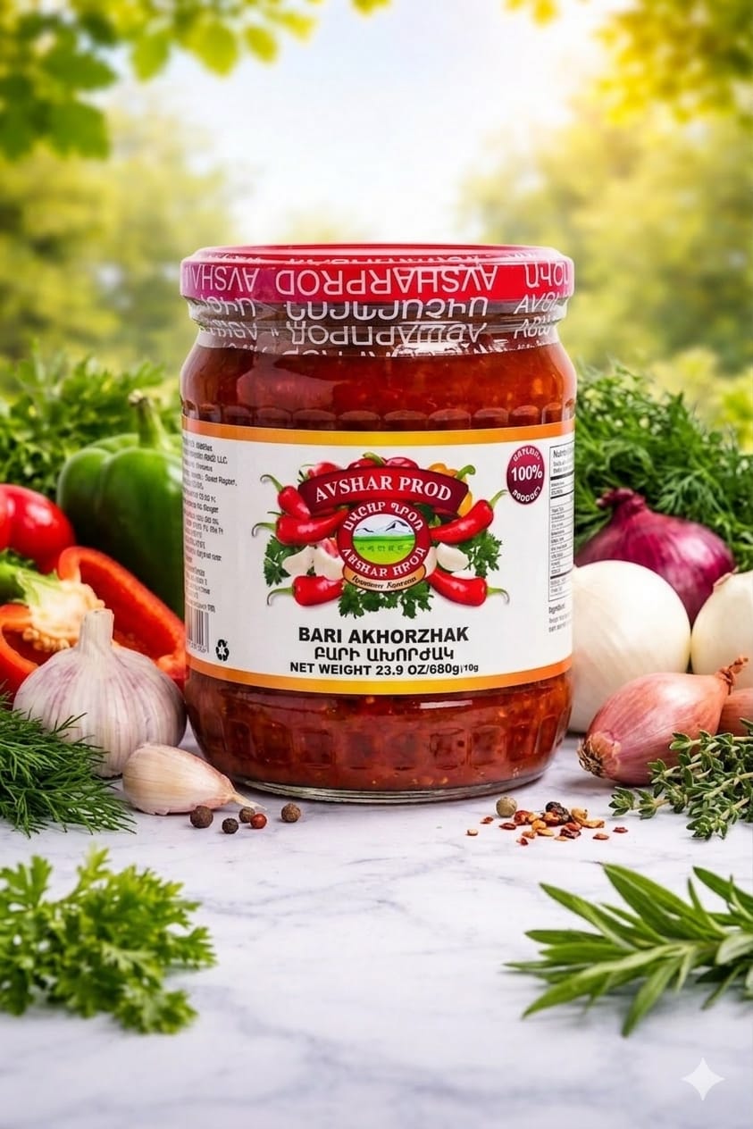 Avshar Appetite 670 g. A flavorful mix of vegetables and spices, prepared in a rich tomato base. This traditional Armenian relish adds a perfect balance of zest and warmth to any meal.