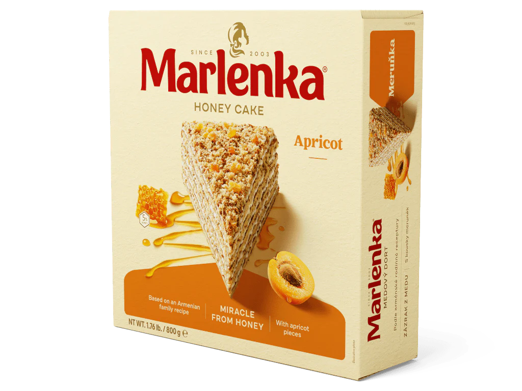 Marlenka Apricot Honey Cake 800 g. A delicate layered honey cake filled with smooth apricot cream and sweet honey. Crafted according to a traditional Armenian family recipe, combining fruity freshness with the signature Marlenka richness. Pack size: 800 g.