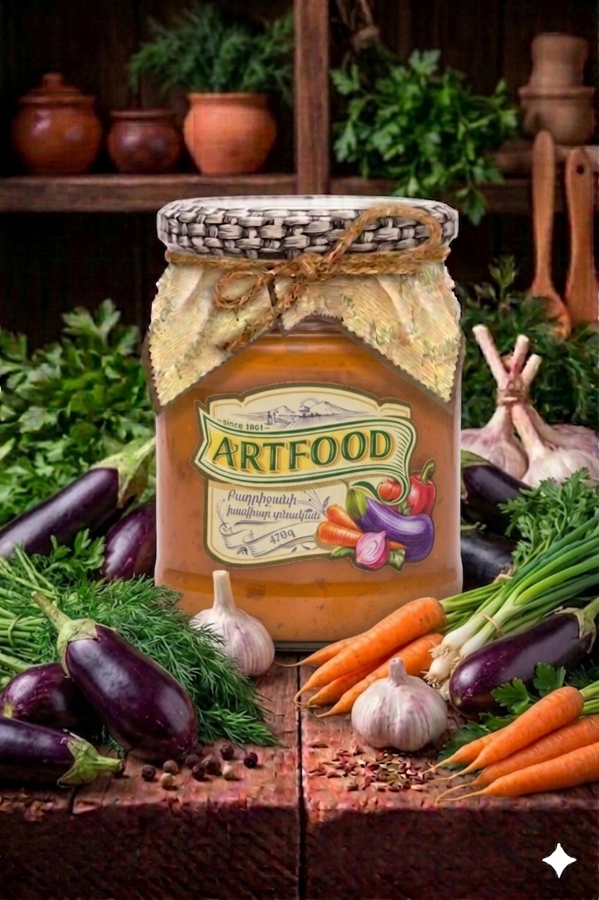 Artfood Eggplant Paste Traditional (Caviar) 470 g. Smooth roasted eggplant spread prepared with tomatoes, onions, and aromatic spices. Classic recipe with rich, smoky flavor. Perfect as a bread spread, appetizer, or side dish. 100% natural, no preservatives.