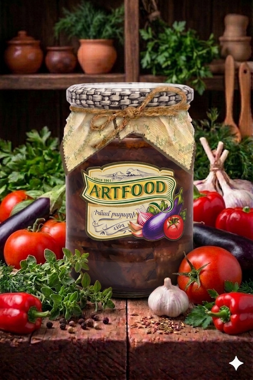 Artfood Imam Bayaldi 450 g. A classic Mediterranean dish of slow-cooked eggplant stuffed with tomatoes, onions, and herbs in olive oil. Rich, tender, and fully ready to serve as a cold appetizer or side dish. 100% natural, no preservatives.
