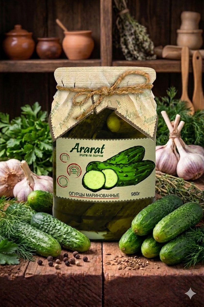 Ararat Marinated Cucumbers 950 g. Crisp and flavorful cucumbers marinated in a traditional Armenian brine with herbs and spices. A perfect balance of sourness and freshness — ideal as a side dish, appetizer, or accompaniment to main courses.