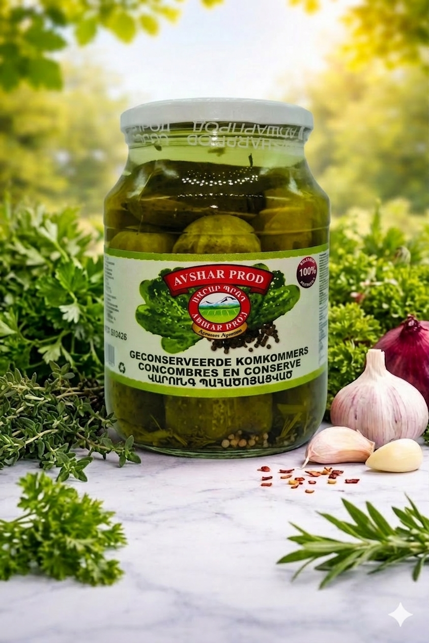 Avshar Marinated Cucumbers 1000 g. Crispy and naturally pickled cucumbers prepared with aromatic herbs and spices. A classic Armenian taste for every table.