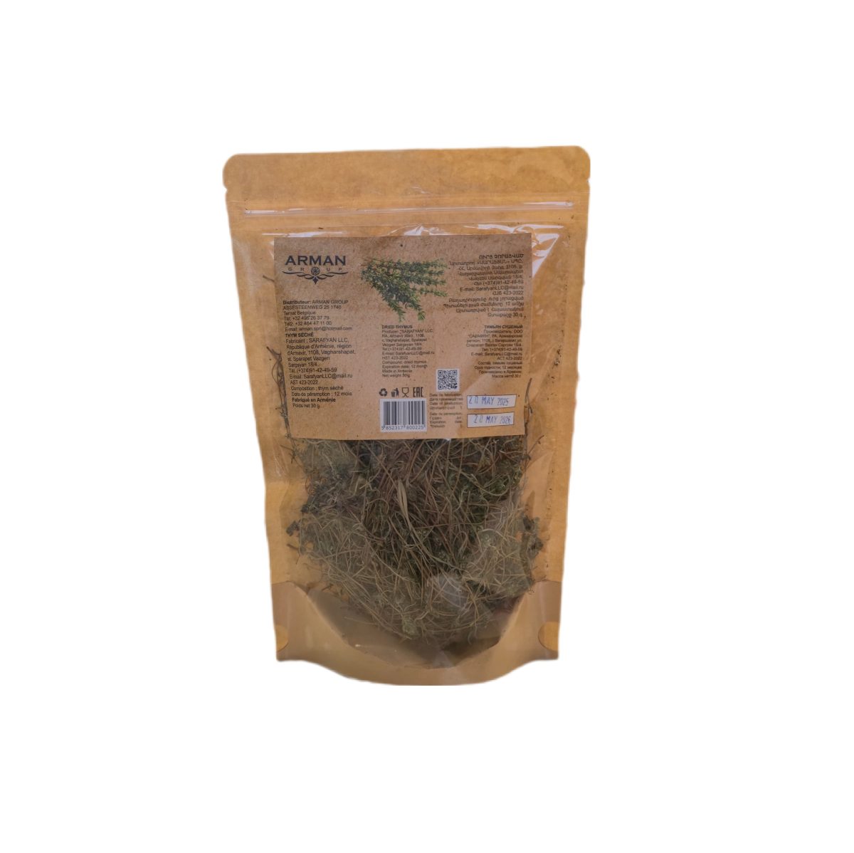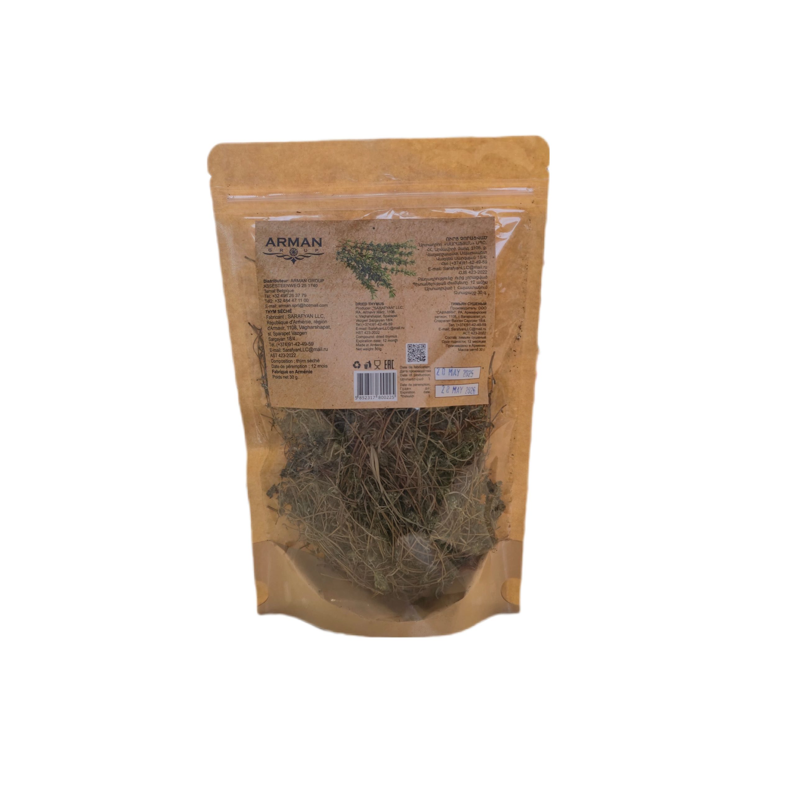 Aromatic dried thyme leaves, famous for their earthy, slightly minty flavor. A staple in Armenian, Mediterranean, and European cuisine. Perfect for soups, grilled meats, vegetables, sauces, and teas. Packed in a convenient 30g bag.