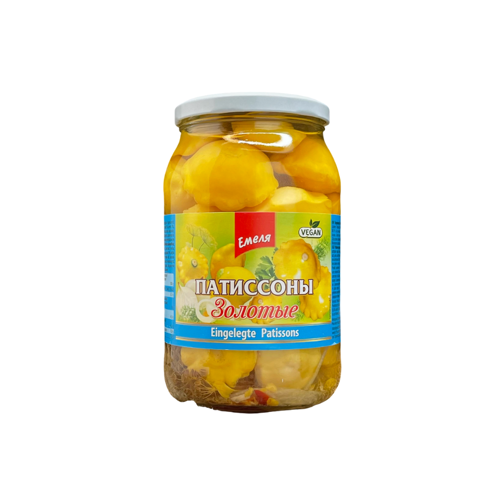 Emelya Golden Patissons 720 g. Tender golden patissons (squash) marinated in a light, aromatic brine with natural herbs and spices. Perfect as a side dish or appetizer, these vegan pickled vegetables offer a crisp texture and mildly tangy flavor.