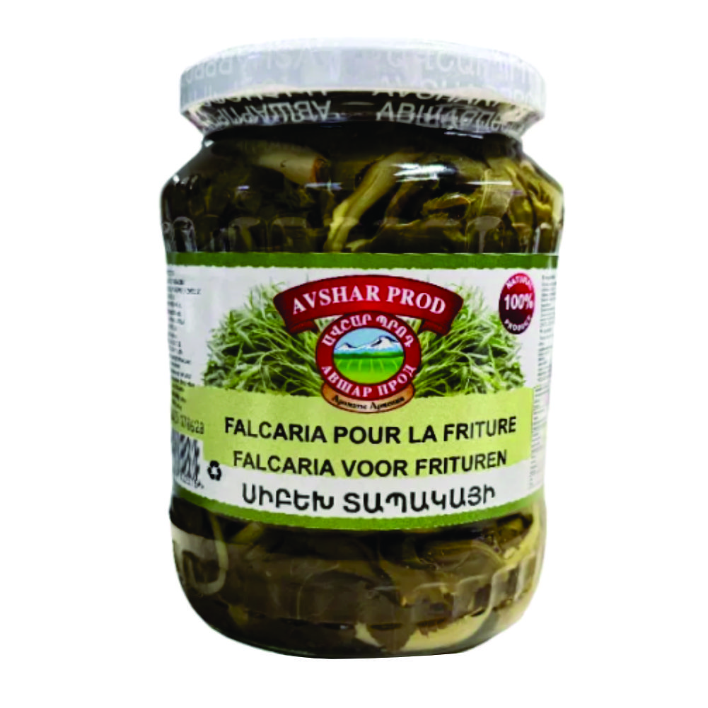 Avshar Fried Falcaria (Mirekh) 680 g. A traditional Armenian delicacy made from the wild herb falcaria, gently fried and preserved for a rich, earthy flavor. Perfect with potatoes, eggs, or as a cold appetizer.