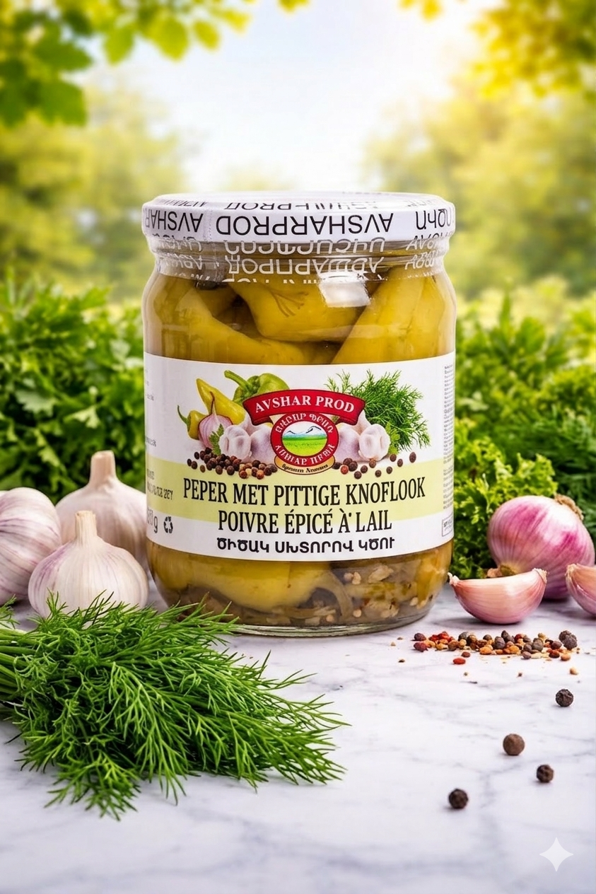Avshar Poivron piquant à l’ail 500 g. Mildly spicy peppers marinated with fresh garlic for an aromatic, balanced flavor. A traditional Armenian delicacy ideal as a side dish or appetizer.