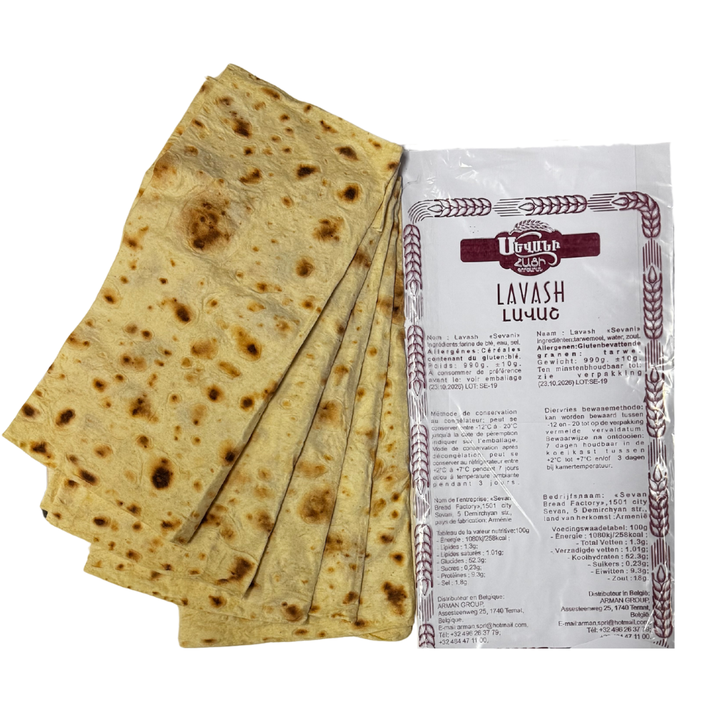 Authentic Armenian lavash bread, produced in Sevan. Thin, soft, yeast-free flatbread made from wheat flour, water, and salt. Naturally preserved, no additives. Package includes around 5 large sheets, approx. 1kg.