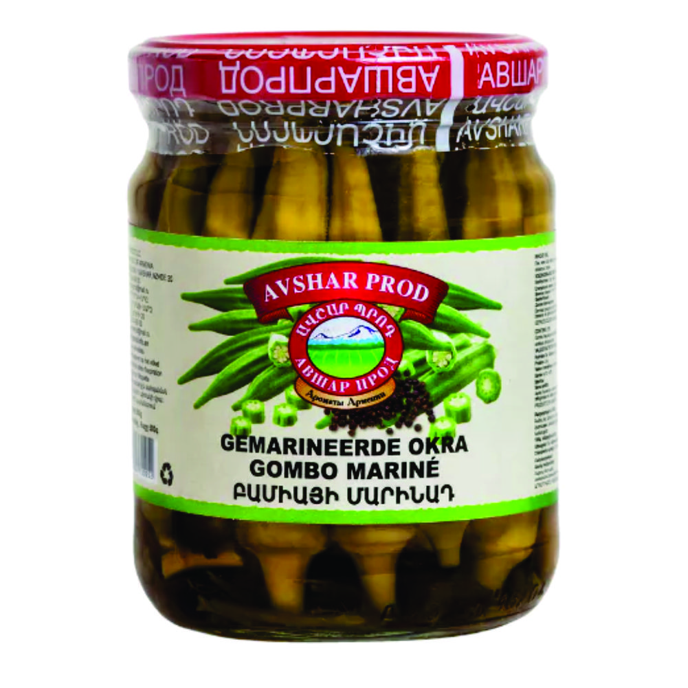 Avshar Marinated Okra 680 g. Fresh okra pods preserved in a delicate brine with aromatic spices. Perfect as a side dish or for adding authentic Armenian flavor to various meals.