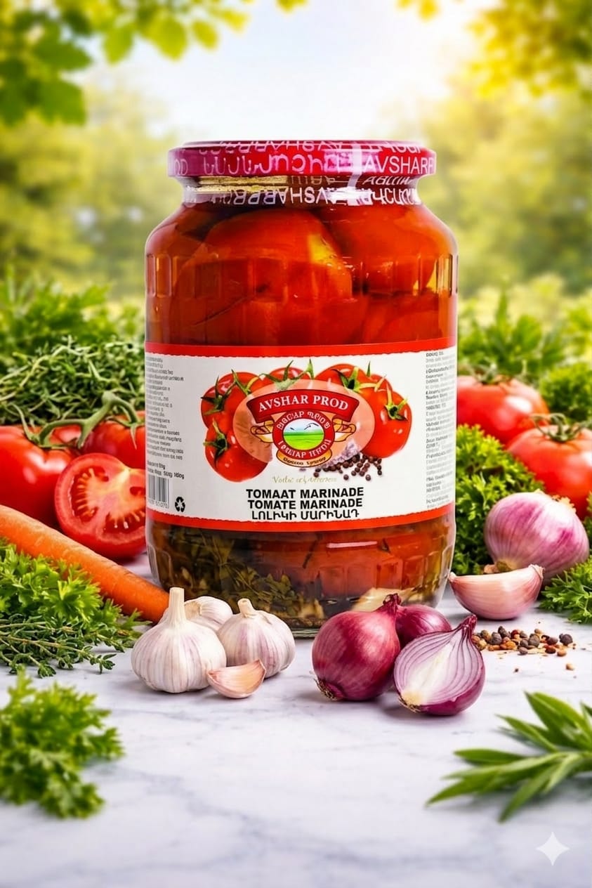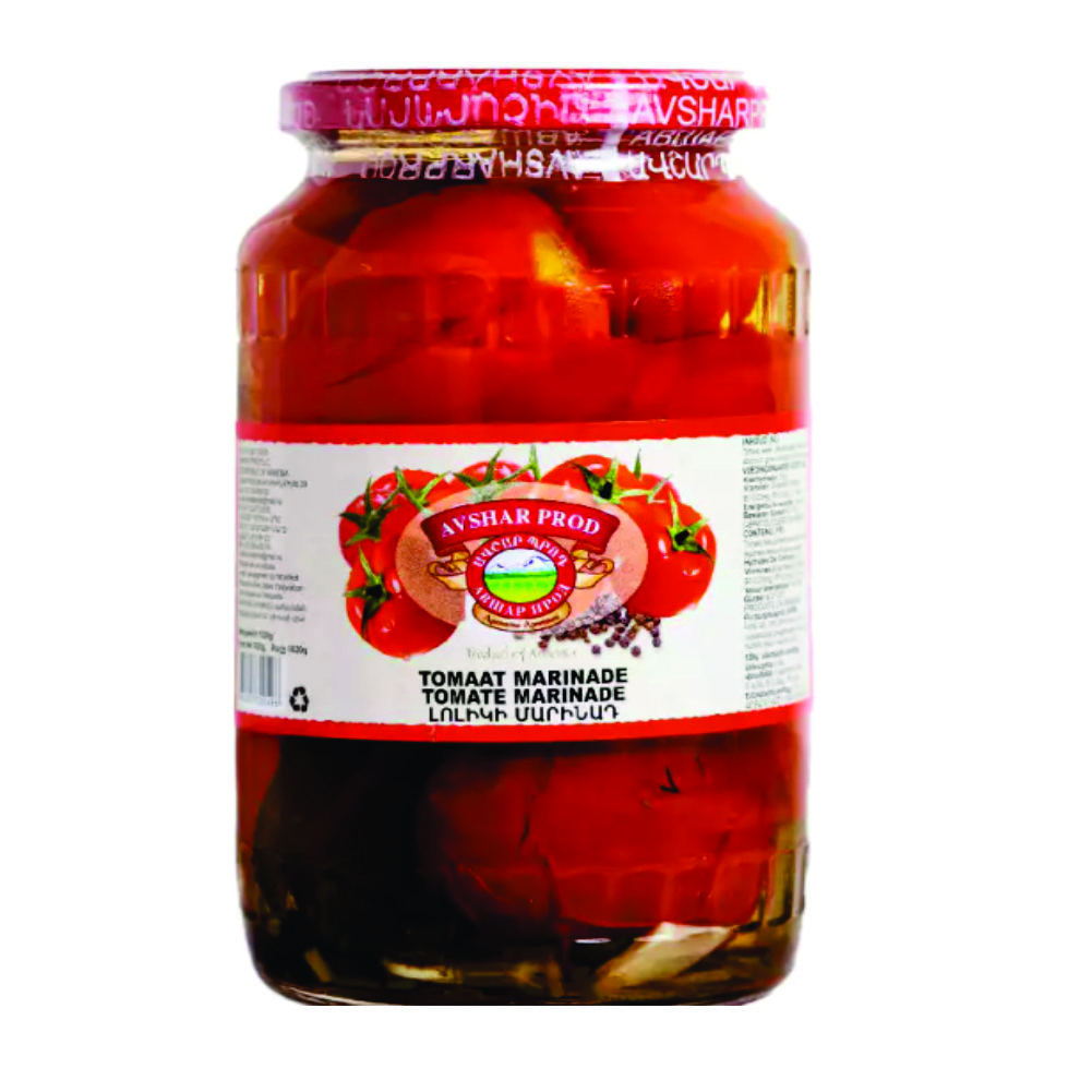 Avshar Red Tomatoes Marinated 1 kg. Whole ripe tomatoes marinated in a flavorful blend of spices and herbs, offering a perfect balance of freshness and tang. Ideal for salads, side dishes, or traditional Armenian meals.