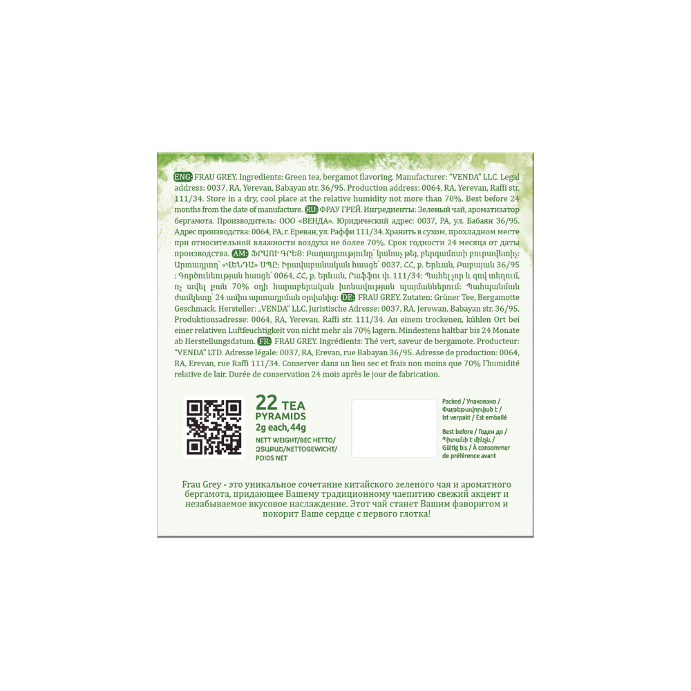 Teida Frau Grey Green Tea 22 pyramids (44 g). A refined blend of premium Chinese green tea infused with aromatic bergamot. This tea delivers a light, refreshing taste with a citrusy note, creating a perfect balance of elegance and vitality. Packed in convenient pyramid bags to preserve full flavor and aroma.