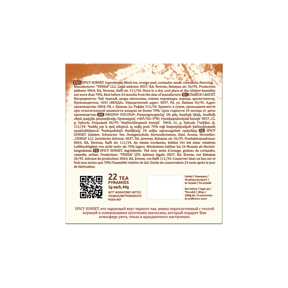 Teida Spicy Sunset Black Tea 22 pyramids (44 g). A warming blend of black tea, orange peel, coriander, and cinnamon. This aromatic infusion combines citrus brightness with gentle spice, creating a cozy, festive, and uplifting flavor. Perfect for chilly evenings or a comforting afternoon break.