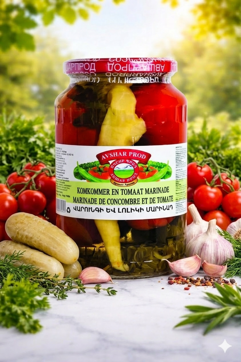 Avshar Tomatoes and Cucumbers Marinated 1 kg. A balanced combination of tender tomatoes and crispy cucumbers, marinated with natural herbs and spices for a rich, traditional Armenian flavor.