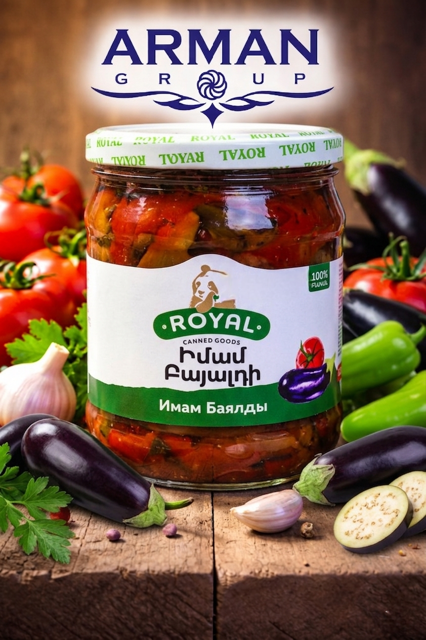 Royal Имам Баялды 520 г. Традиционное блюдо из баклажанов, томатов, лука и специй, медленно тушённое в растительном масле. Мягкая текстура и насыщенный вкус. Отлично подходит как закуска или гарнир.