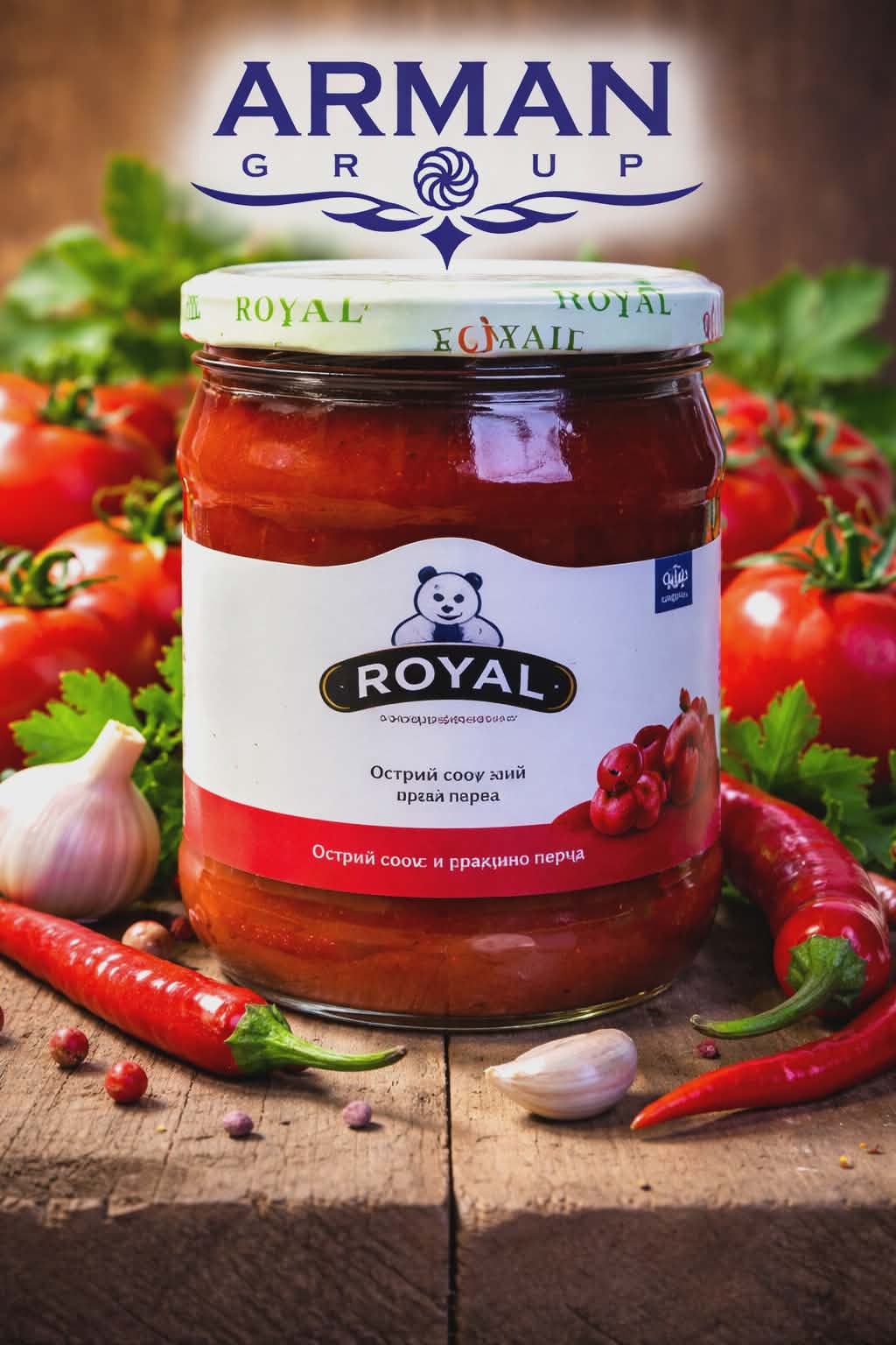 Royal Ajika Piquant 500 g. A bold, spicy blend of tomatoes, peppers, garlic, and aromatic herbs. Perfect with meat, fish, or bread.
