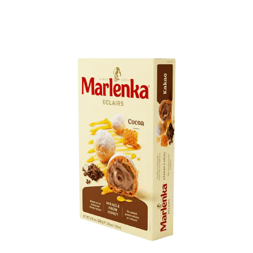 Marlenka Эклеры с какао 250 г. Мягкие мини-эклеры с нежной какао-кремовой начинкой, посыпанные сахарной пудрой. Шоколадный вариант знаменитых эклеров Marlenka с естественной медовой сладостью. Отлично сочетаются с кофе или чаем. Упаковка: 250 г.
